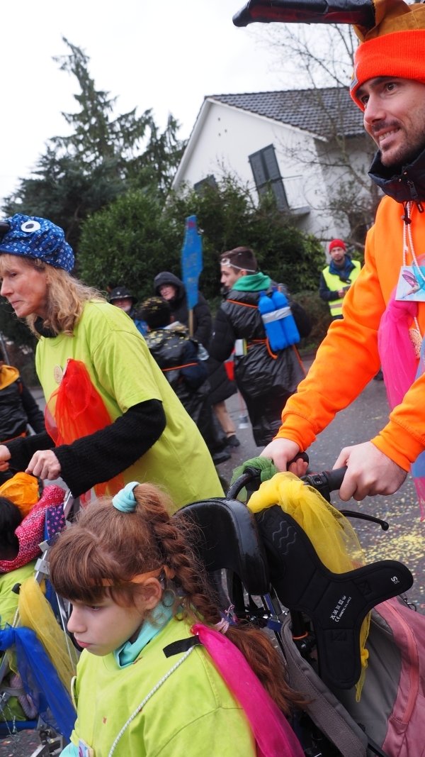 So laufen wir los und sehen durch die neu organisierte Route viele Kostüme der anderen Klasse. Wir ziehen nämlich die ganze Gutenbergstraße aneinander vorbei, wodurch das muntere Gewusel von Farben und Kostümen noch besser bestaunt werden kann. Und so ziehen wir Stück für Stück, begleitet von der Fasnachts-Musik, in Richtung KUSPO.