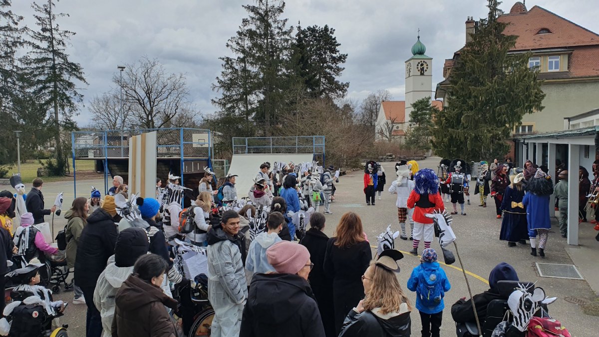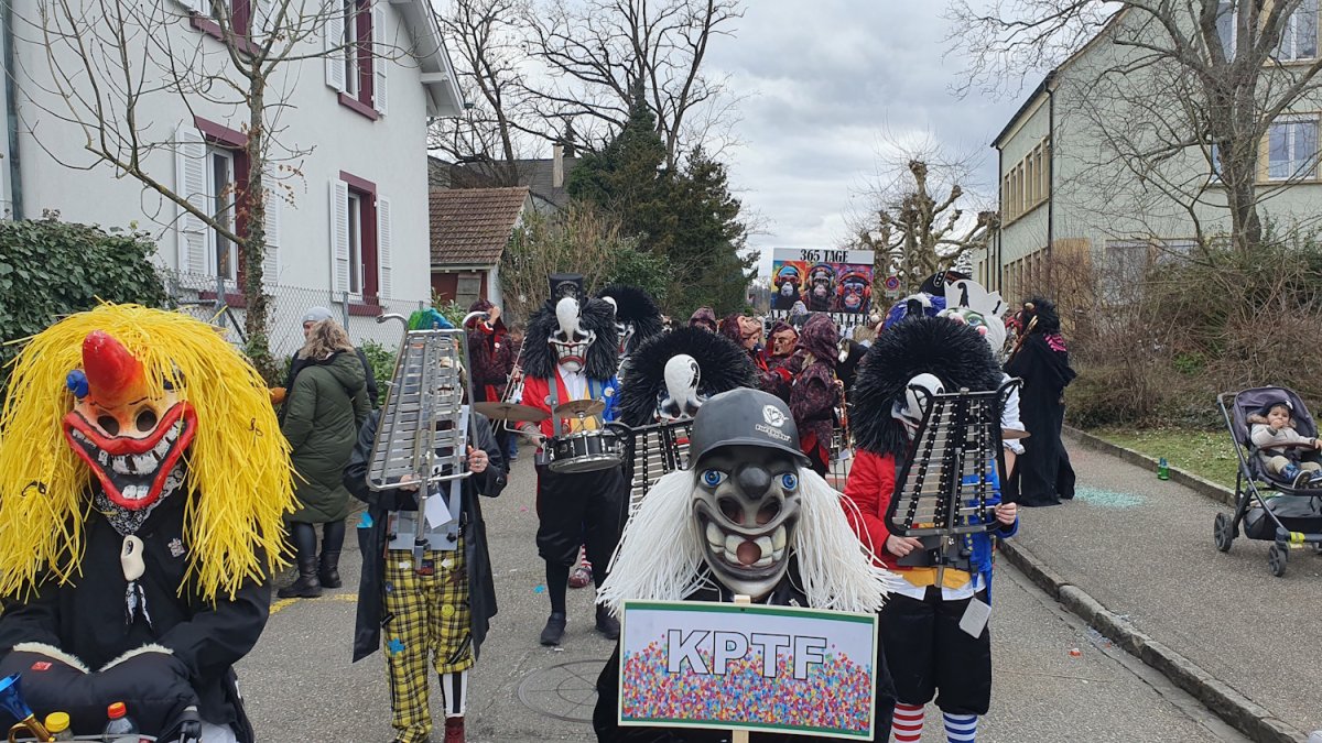 Mr sammle ys alli zämme uf em Schuelhuusplatz vom Loog Schuelhuus und alli warte gspannt. Wie mr das abgmacht hän gseht me vor allem viel Schwarz-Wyss und Zebras. Es isch s erste Mol, dass mr sone gmeinsam Sujet hän und es isch lessig zum gseh, wie unterschiedlig d Klasse das umgestzt hän bim baschtle. Es steggt viel Arbet drhinter. Und d’Hauptsach isch, dass es am Schluss mit eme Lächle drait wird. Au das Joor wärde mr begleitet von ere Guggemusigg wo sich extra für unseri KPTF Fasnacht zämme gwürflet het. D’ Freud stygt mit de erste Styggli als Platzkonzärt und denn gohts scho bald los uf d’ Route. Die fiehrt ys durch s Quartier und em Bahndamm entlang zum KUSPO. Uf em Wäg gniesse mr die viele Lyt am Strooserand wo nadyrlig unseri Dääfeli und Räppli abbikömme. Mit dr Musig vorus nöchere mr ys em KUSPO wo mr e glaini Stärkig zue ys nämme. Es git Weggli und Schoggistängeli zur Fier vom Daag. Gstärkt göhn mr denn nomol uuse, wo mr vo der Gugge nomol drey Styggli dörfe loose. Jetzt isch au wieder Zyt zum tanze und alli schwelge nonemol in de Fasnachtstön. Härzlige Dangg an alli wo fyr uns musiziert händ, es isch ys wie allewyl e grossi Freud gsi.